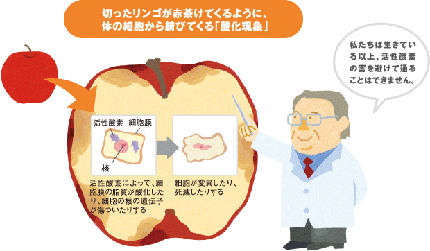 日常的にも、皮をむいたリンゴが変色したり、バター黄色くなったりする現象です。放っておくと、ボロボロになっていきます。体表はこれと同じ外圧に晒され、実際に細胞膜の脂質は常に酸化させられています。